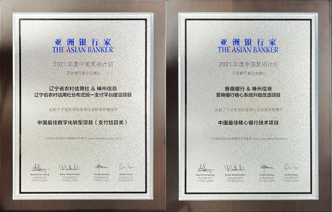 7月22日,由亚洲银行家主办的“2021中国未来金融峰会暨中国奖项计划颁奖典礼”在北京举办。神州信息“晋商银行核心系统升级改造项目”、“辽宁省农村信用社分布式统一支付平台建设项目”分别荣获亚洲银行家中国奖项计划“中国最佳核心银行技术项目”、“中国最佳数字化转型项目(支付结算类)”两大奖项。